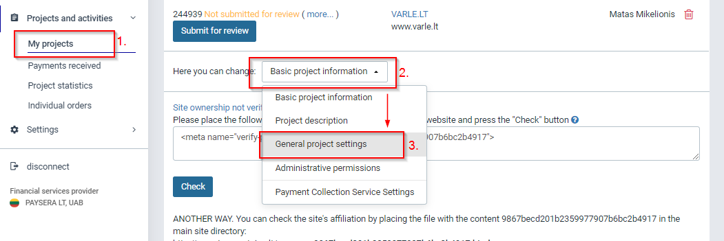 How to prepare a paysera project for trading on the varle.lt platform. Click on screenshots to enlarge.