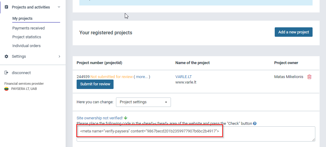 Paste only the code between the quotes into the box. For example: <meta name="verify-paysera" content="0da3e051580ef72818ebf3e95c51f083">.We only need to provide the following line of code: 0da3e051580ef72818ebf3e95c51f083