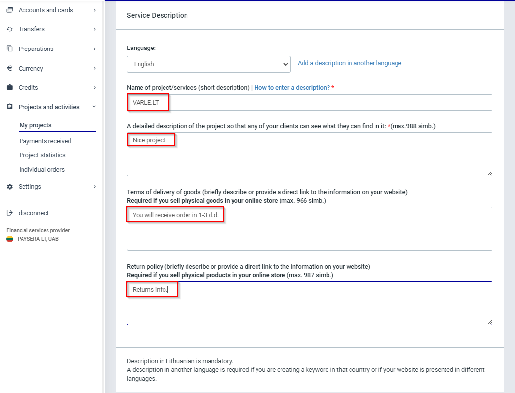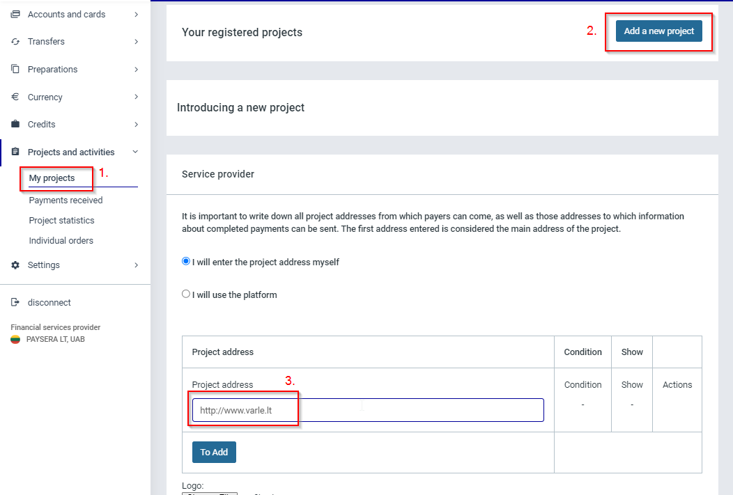 How to prepare a paysera project for trading on the varle.lt platform. Click on screenshots to enlarge.