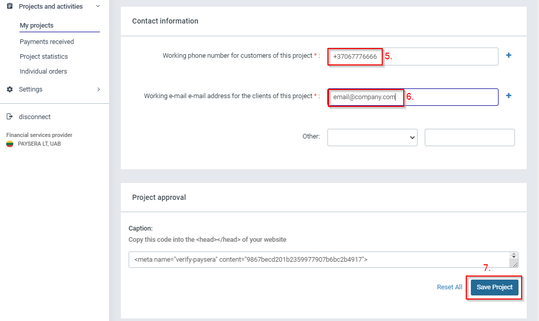 Paste only the code between the quotes into the box. For example: <meta name="verify-paysera" content="0da3e051580ef72818ebf3e95c51f083">.We only need to provide the following line of code: 0da3e051580ef72818ebf3e95c51f083