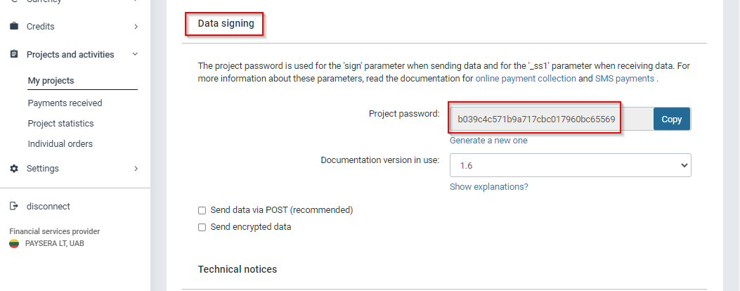 In the form where you fill in the data, you will need to enter: Paysera project ID; Paysera project password; Paysera meta